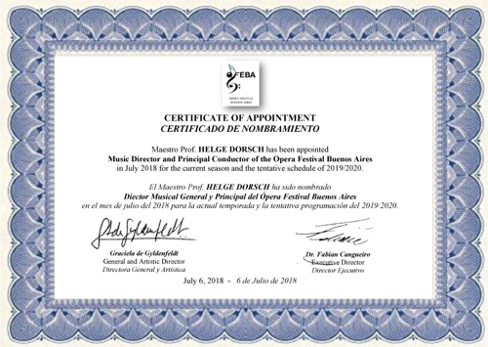 Prof. HELGE DORSCH wurde im Juli 2018 zum Musikdirektor und Chefdirigentendes Opernfestivals Buenos Aires für die aktuelle Saison und Spielzeit 2019/20 ernannt.Geschäftsführer, Dr. Fabian Cangueiro