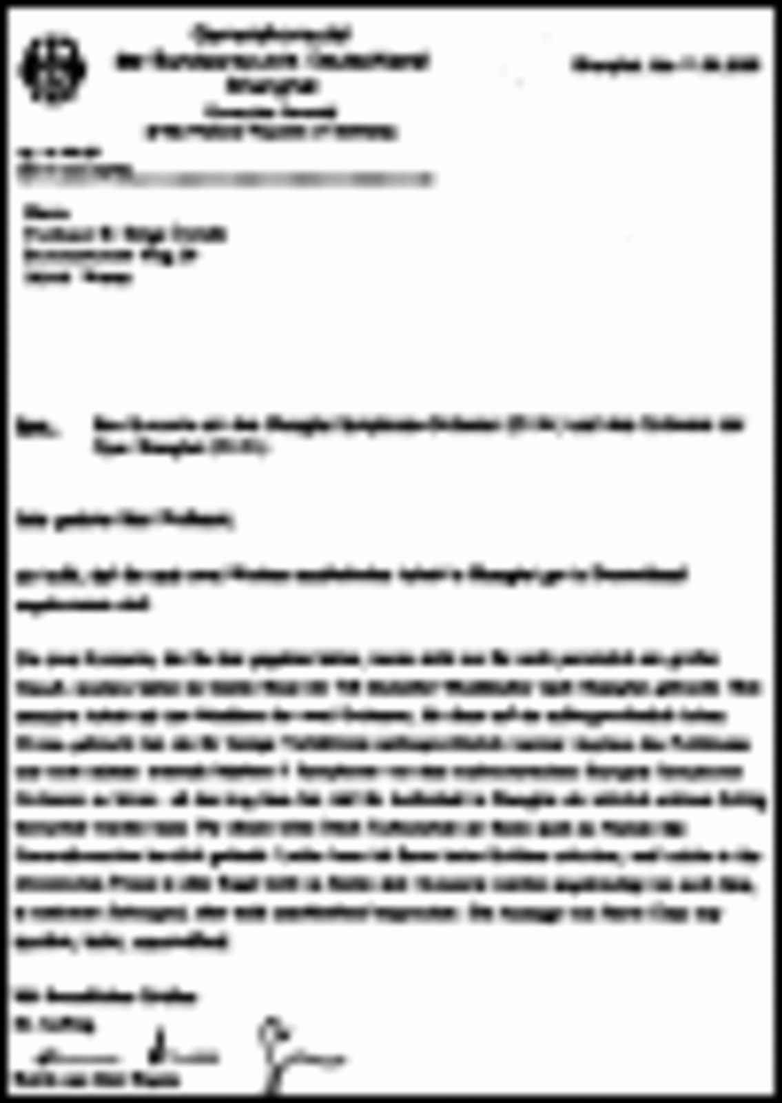 Die zwei Konzerte, die Sie hier gegeben haben, waren nicht nur für mich persönlich ein großer Genuß, sondern haben im besten Sinne ein Teil deutscher Musikkultur nach Shanghai gebracht: Ihre intensive Arbeit mit den Musikern der zwei Orchester, die diese auf ein außergewöhnlich hohes Niveau gebracht hat, ein für hiesige Verhältnisse außergewöhnlich warmer Applaus des Publikums und nicht zuletzt: erstmals Mahlers 5. Symphonie von dem traditionsreichen Shanghai Symphonie Orchester zu hören - all das trug dazu bei, daß Ihr Aufenthalt in Shanghai als wirklich schöner Erfolg betrachtet werden kann. Für dieses echte Stück Kulturarbeit sei Ihnen auch im Namen des Generalkonsulats herzlich gedankt. Leider kann ich Ihnen keine Kritiken schicken, weil solche in der chinesischen Presse in aller Regel nicht zu finden sind. Konzerte werden angekündigt (so auch Ihre, in mehreren Zeitungen), aber nicht anschließend besprochen. Die Aussage von Herrn Chan war insofern, leider, unzutreffend.