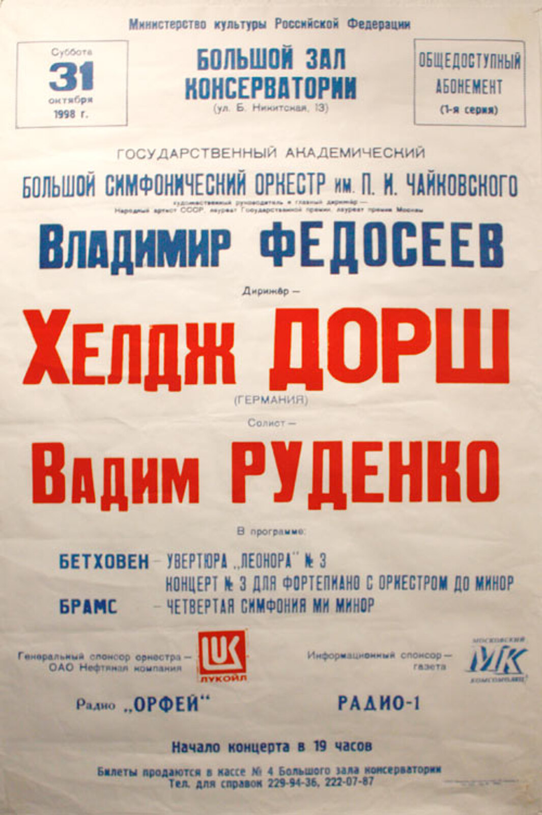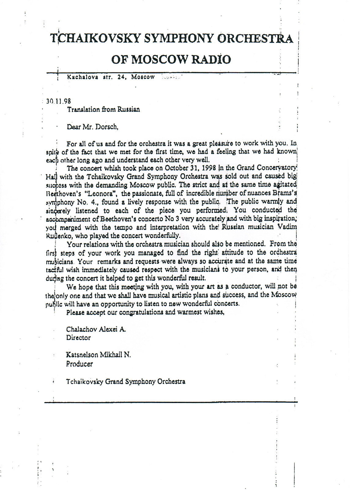 The concert whish took place on October 31. 1998 in the Grand Conservatory Hall with the Tchaikovsky Grand Symphony Orchestra was sold out and caused big success with the demanding Moscow public. The strict and at the same time agitated Beethoven's "Leonora", the passionate, full of incredible number of nuances Brams's symphony No. 4., found a lively response with the public. The public warmly and sincerely listened to each of the piece you performed, You conducted the accompaniment of Beethoven's concerto No 3 very accurately and with big inspiration;