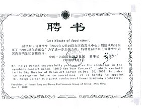 Maestro Helge Dorsch wird aufgrund seines erfolgreichen Dirigates des Neujahrskonzertes 2010/11 im Großen Saaldes Henan Art Centers hiermit zum "Ständigen Gastdirigenten" des Henan Symphonieorchesters ernannt.Präsident Zhou Hong