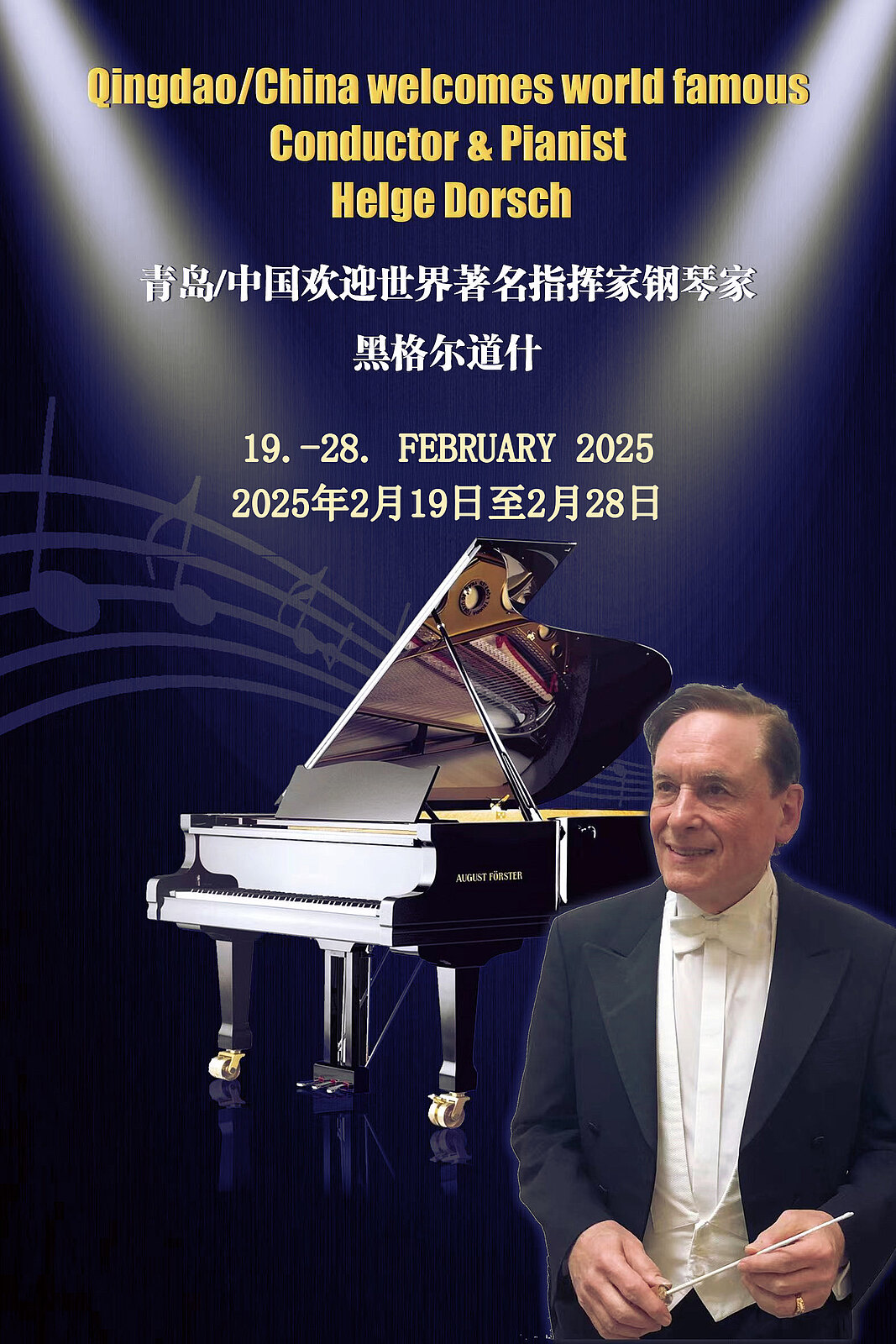 Vom 19. bis 28. Februar 2025 tritt der talentierte Dirigent und Pianist Helge Dorsch in Qingdao, China auf. Bekannt für seine einzigartige Art, Musik zu leben und zu vermitteln, wird er das Publikum mit seiner Interpretation und seiner Leidenschaft sowohl als Dirigent als auch als Pianist begeistern.