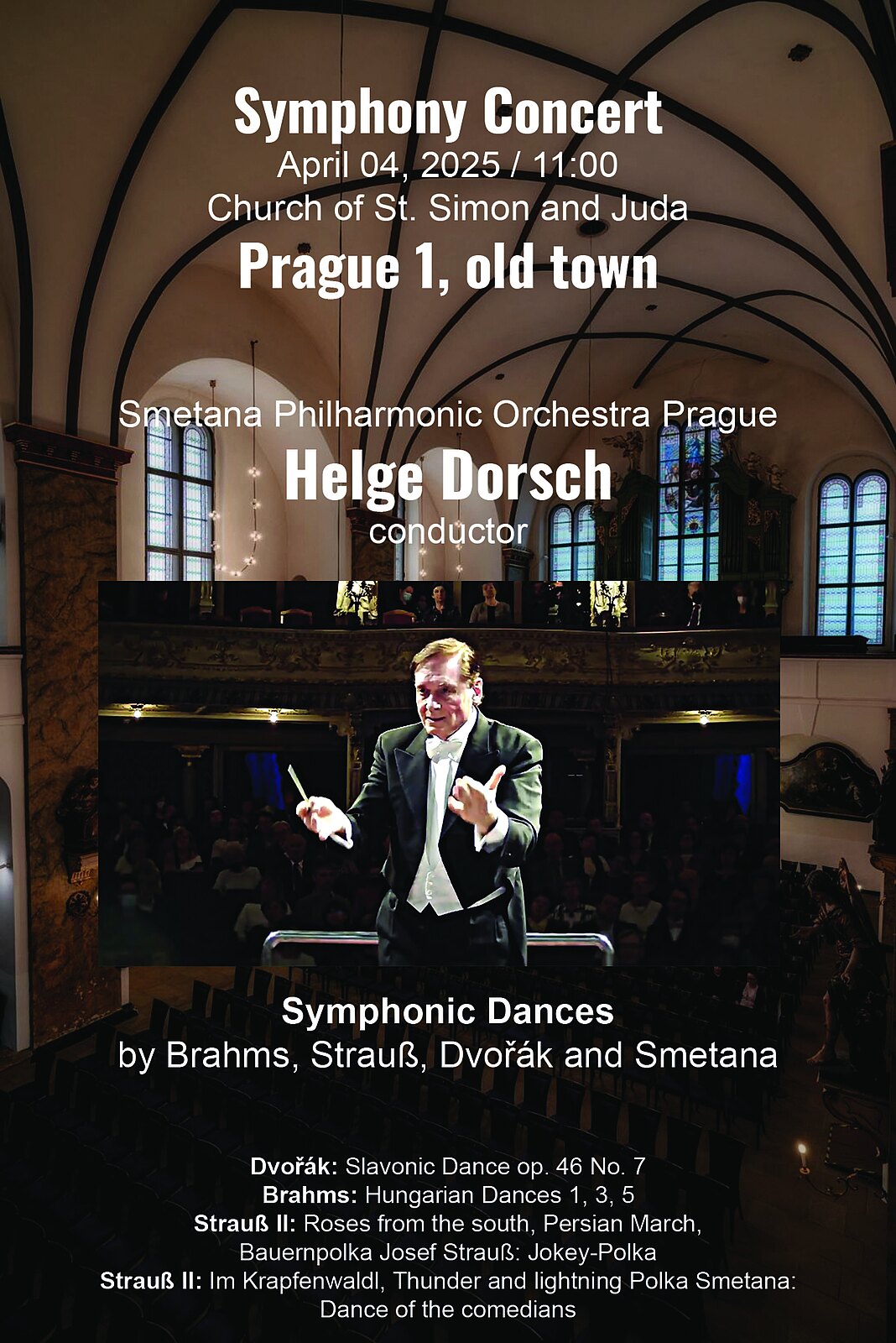 Prag wird am 4. April 2025 zum Schauplatz eines musikalischen Highlights: Der renommierte Dirigent Helge Dorsch führt die Smetana Philharmonic Orchestra Prague durch ein mitreißendes Programm voller Symphonischer Tänze. Das Konzert beginnt um 11:00 Uhr in der stimmungsvollen Kirche St. Simon und Juda in der Altstadt von Prag.