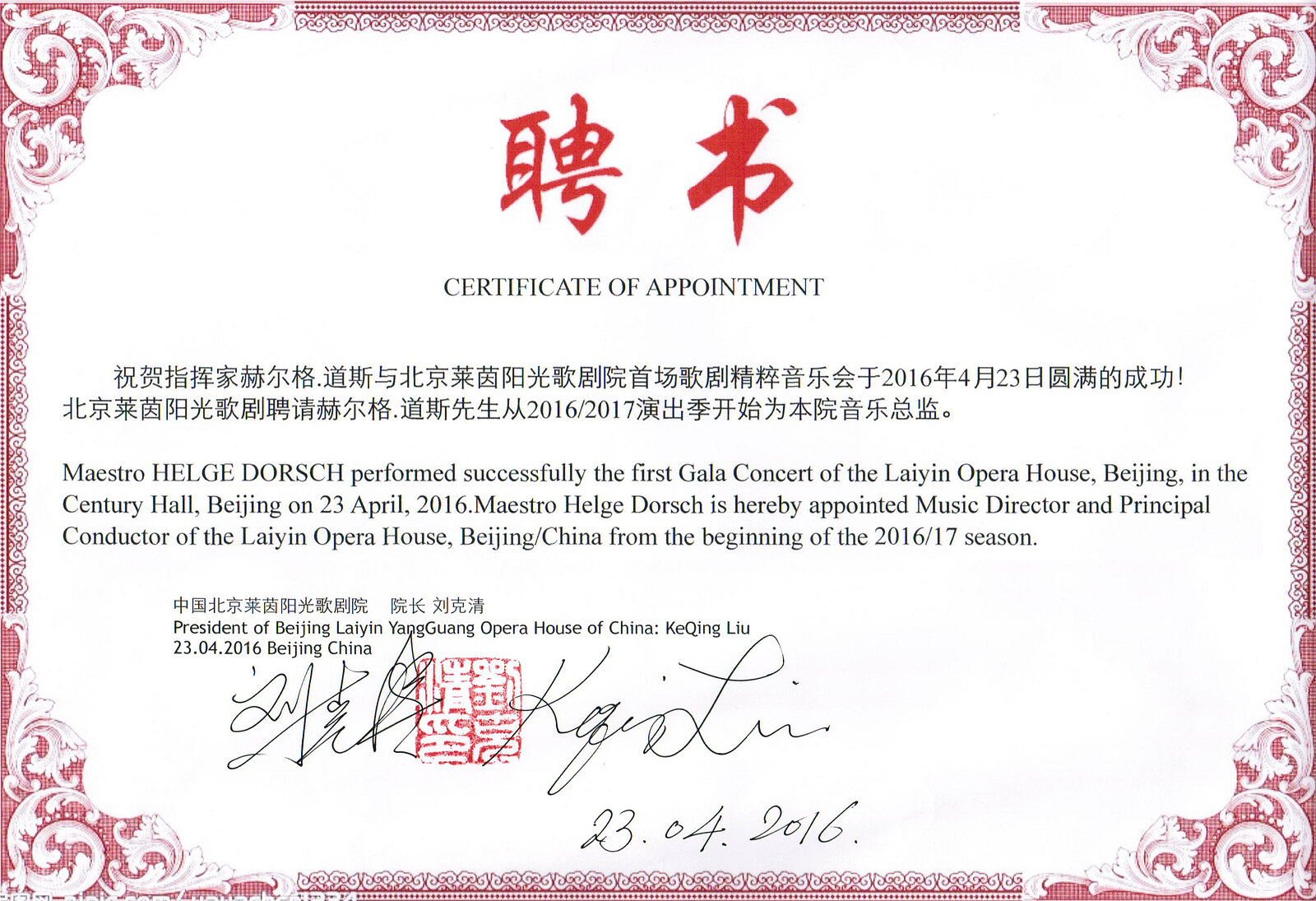 Musikdirektor und Chefdirigent des neuen Opernhauses Peking/China